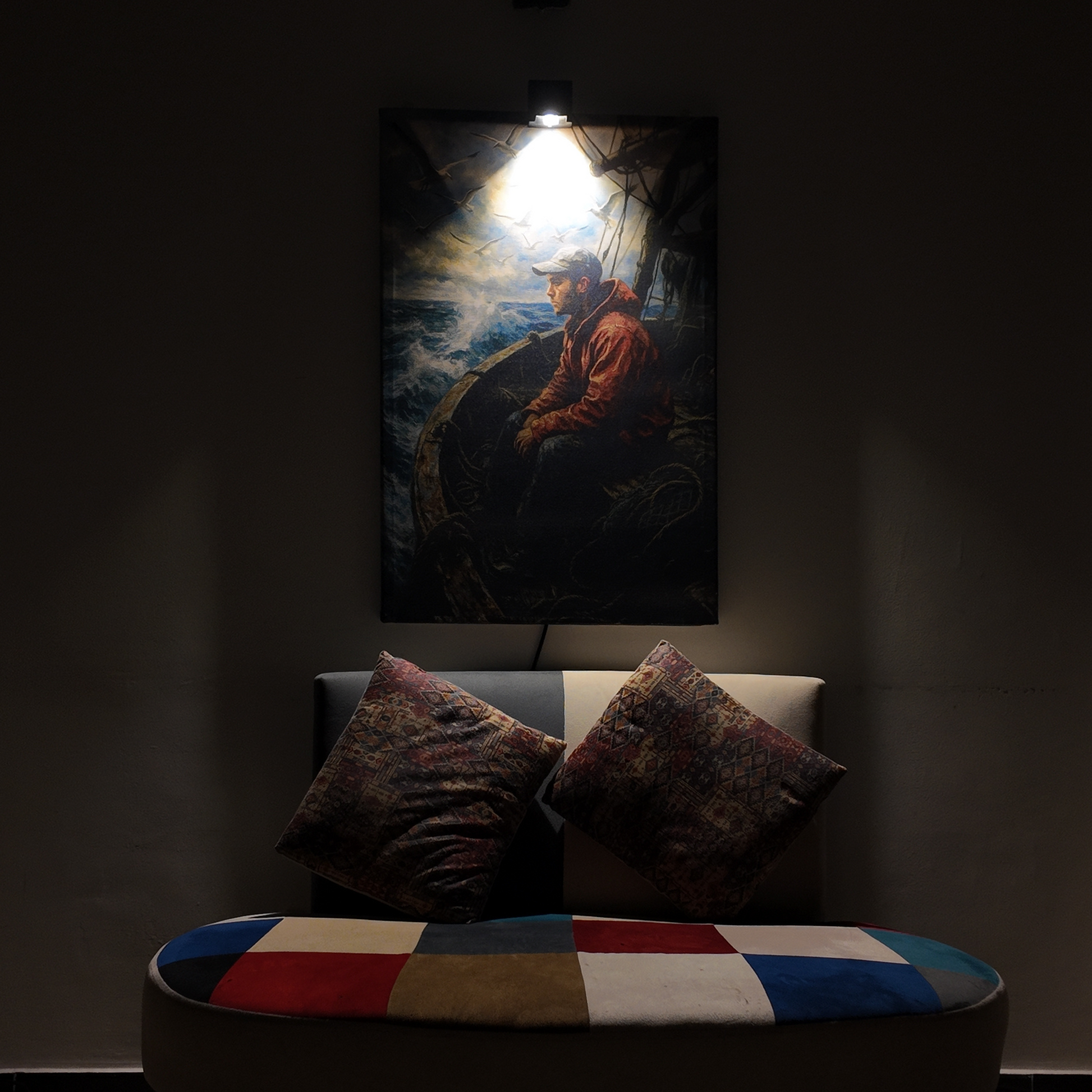 This 2x3 ft illuminated canvas captures the timeless resilience of man against the infinite sea. A lone sailor, seated in quiet reflection, becomes the heart of the artwork. The integrated light highlights his figure, drawing viewers into the raw power of the ocean, the silence of solitude, and the eternal struggle between man and nature.